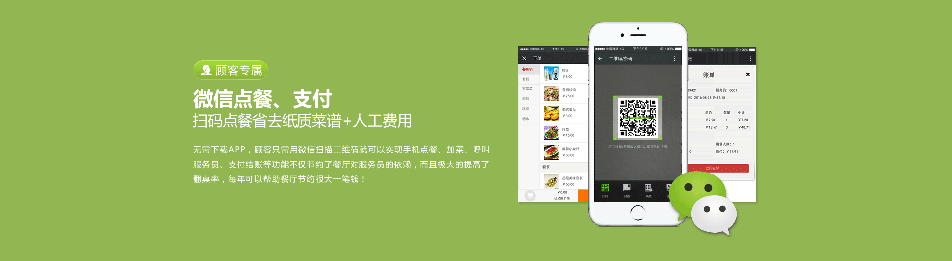 微信扫描就能点菜,大大缩短了点菜、下单、结账时间,高效用餐,增加顾客对服务的满意度。